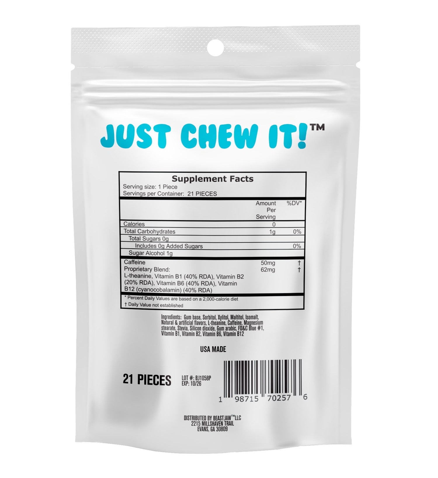 Each piece combines natural caffeine with L-Theanine and essential B Vitamins to support alertness, focus, and steady energy — without overstimulation.